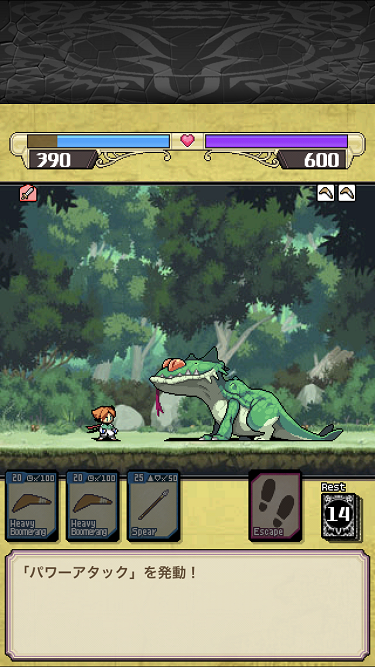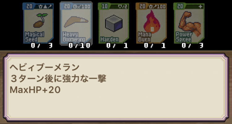 コンボの手順としては、ヘビィブーメラン→ヘビィブーメラン→パワーアタックの順に3ターン目まで発動します。これで、4ターン目終了時までに600ダメージ与えることが確定されるのです。